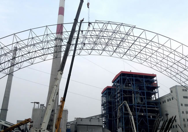 7) 平面鋼桁架的特點:常規的屋面體系為平面受力體系,平面外的剛度及穩定靠復雜的支撐體系來保證,支撐的桿件強度得不到充分的發揮,因此耗鋼量大。且桿件類型、規格繁多,節點種類多而復雜。體系傳力路線長,節點連接部分薄弱,容易應力集中,對抗震及抵抗行車的水平力、約束汽機房外側柱均不利。鋼桁架、屋面板自重大,需大型機械進行安裝。